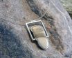 Ein modernes Collier, aus Silber der Probe 925 und Striped Flintstone. Größe des Colliers Elementes ca 2,5x4,3cm, Gewicht ca 8,5g, aufgehängt   ist es an einen Stahlseil mit Silberverschluß, ca 43 cm Halsumfang