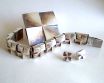 Ein sehr schönes avantgardistisches Set aus oxydierten und bearbeiteten 925 Silber. Bestehend aus Armband, Brosche und Ohrringen